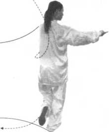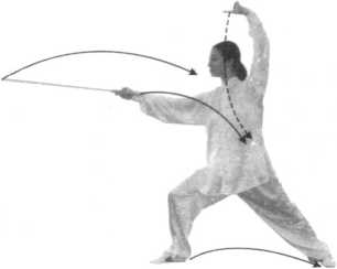 剑法:右手握剑先随上体左转稍向左摆,随上体右转边翻转边 以剑柄领先向右回带,手心向下,剑身摆置于右肩前, 剑尖向左(正西),左剑指向上绕行于右肩前。