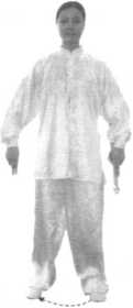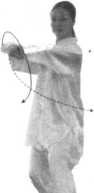 i \图 3 -60【动作1:后坐接剑】(图3-60)身法:上体右转,重心后移。步法:重心后移,右膝屈蹲左腿自然伸直。剑法:右手握剑屈肘向右后方(正北)回抽,手心向里,剑 身横置于胸前,剑尖向前(正南)。同时,左剑指边随 右手回抽,边放开指成掌,掌心向外(两手心内外相 对),接握剑的护手。眼法:眼视剑柄。中国养生【太极剑】【太极扇】图 3-61