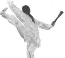 踢腿和撩扇要同时进行,上身向后拧转,支撑腿微屈以利 于稳定。