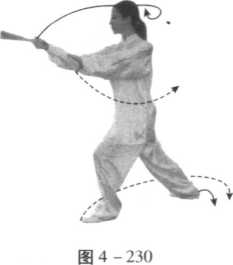 右腿直接向后落步成左弓步,上身左转;同时,右手握扇 外旋,扇首领先从腰间向左腋下穿击,左臂随之下落于额前, 目视穿扇方向(图4 -229)。