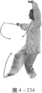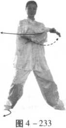 步法不变,重心移到左腿,右手握扇在空中划弧,向左臂 上方合按,左臂顺势向右合臂,同胸高,目视左斜前方 (图 4 -233)。