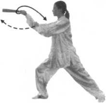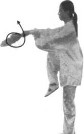 空中云扇时,要以腰带臂,两臂合时要有一种相对用力的 过程。以上几动要连贯完成,整个身体在摆扣步中走个圆,然 后穿云扇在步法走圆中完成。