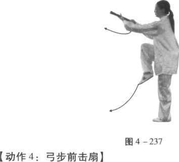 右脚向前落步成右弓步;同时,两臂微下移,然后右手直 接向前出击扇,力达扇首,左臂收合于右臂内侧,目视扇器前 方(图 4 -238)。