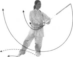 图 3 -31【动作1:收脚后绕】(图3-31)身法:上体左转,重心后移。步法:随重心后移,左腿屈蹲,右脚提起稍回收(脚不触地)。』柩 养生【太极剑】【太极扇】1■剑法:右手握剑边外旋边向上,向左后划弧绕至左肋前,手心 向里,剑尖斜向左上方,同时,左手剑指划弧下落于右 腕部。眼法:眼随剑转,眼看左侧。图 3 -32