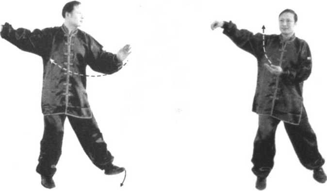 ②同时身体重心继续左移,最后完全移至左腿;右脚前掌 随即轻轻提起,收向左脚内侧(相距10~20厘米)轻轻落 地,前脚掌先着地,全脚掌再踏实,脚尖与膝盖上下相对,都 朝南方,两腿保持屈膝状态。