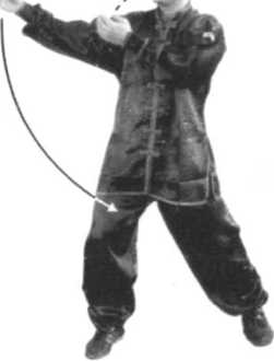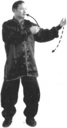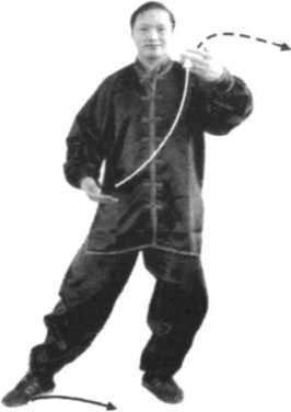 ②随转体左手(手心向里、虎口向上)经面前划弧至身 体左侧,保持屈肘,手心斜向里,指尖高与鼻平;同时随转体 右手向下划弧至腹前,掌心由向右逐渐翻转至斜向上。