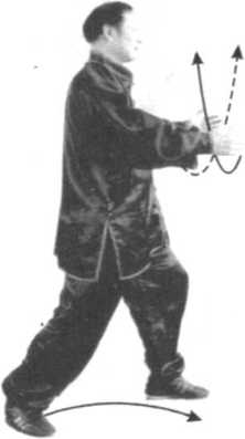 ②同时左脚掌踏实,左腿屈膝前弓,右腿自然伸直,身体 重心前移成过渡左弓步,上体保持正直。