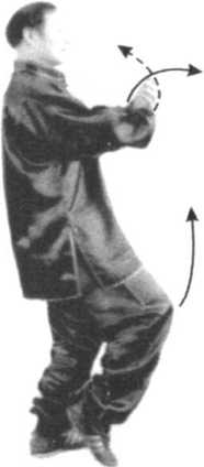 ③同时两手经两侧向腹前划弧,手心斜向里,肘部微屈。