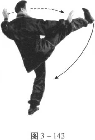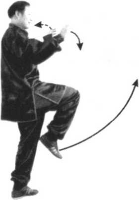 ①身体重心完全稳定在左腿,膝部微屈;右腿屈膝上提, 脚尖自然下垂。