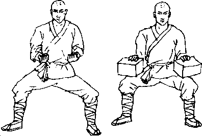 练习时,至少每日站马步10次,每次10分钟起,逐渐加 长,次数逐渐减少,直至站马步至1个时辰,而不喘不汗,则第 一步功成(图5),在练习时,如觉力尽,则可散步以解其困,待 气力复原后,再依法练习。此时两腿之力,决非寻常人所及。之 后,可将10斤重的两块石板压于两膝上(图6),然后每隔3 月加10斤;,直至两腿能各承50斤巨石,并能站半个时辰为 止,则第二步功成。此时,两腿之劲,不下千斤,竟如铜浇铁铸 生根一般,虽多人推挽,亦似蜻蜓之撼石柱。