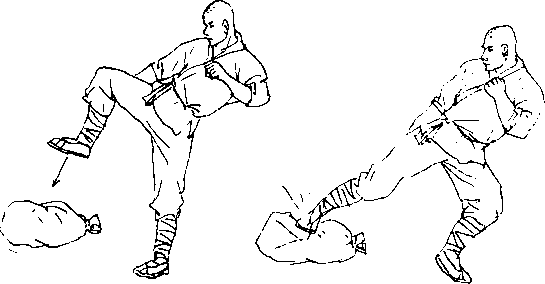 初练时,立正站立,气沉丹田,并下注足心,然后抬腿发 声,狠跺沙包(图7、图8),每日早、晚各一次,每次练200踏。