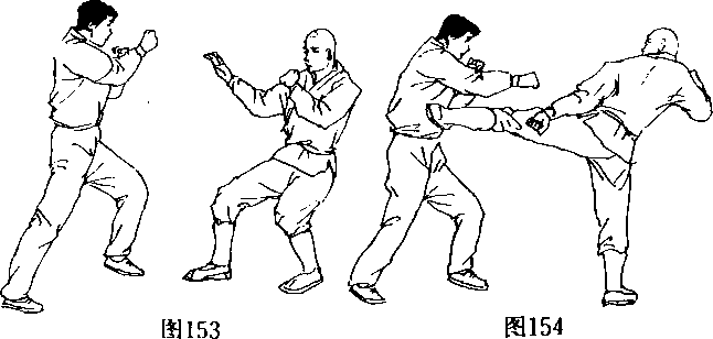 双方由基本格斗姿势开始(图153),我佯攻对手上盘,然 后,迅速将右前前拉,接近对手创造有利的腿击距离,随后,迅 速抬起左脚,并用一记突然、有力的中盘侧踹腿出其不意的打 击对手的腹部要害(图154),将其防线和阵脚打乱;不待对手 退出我方的有效打击距离,便又在落稳左脚为支撑脚的同时 (图155),向左转身并带动右腿以前低扫踢重击对手的前腿 踝关节(图156),令敌防不胜防;为了最终击倒或击伤对手, 可再在迅速落稳右脚的同时,迅速下蹲并向左后方转体且准