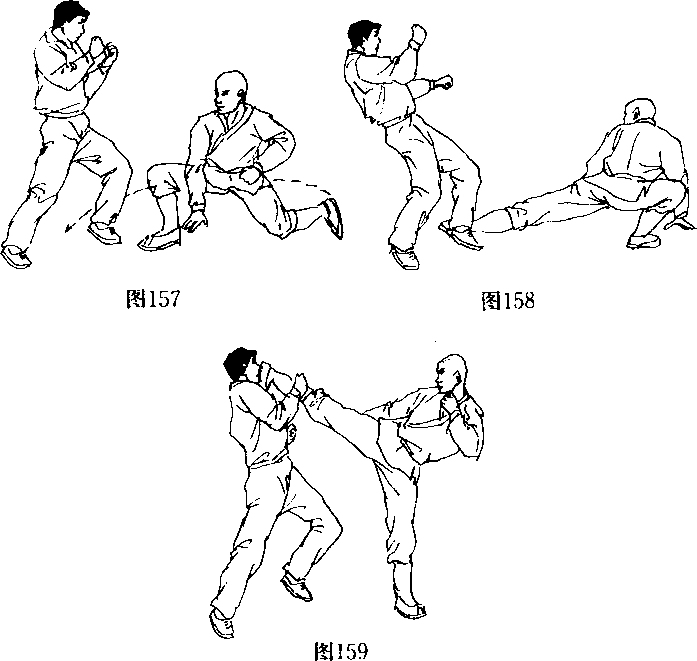 确地捕捉住自己所欲连续击打的目标(图157);接着双手扶 地用左脚以一记贴地后扫腿猛力攻向对手的踝关节(图 158),如对手反应甚快,并连续避过了我方的连环三腿时,可 再用一记具有毁灭性力量的右侧踹腿去重创对手的中盘或上 盘致命要害处(图159),将其踢昏或击倒在地。