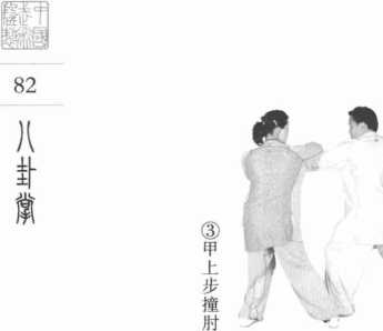(3) 甲方右脚上步,右臂屈肘盖压乙方左肘(图2-4-33③)。