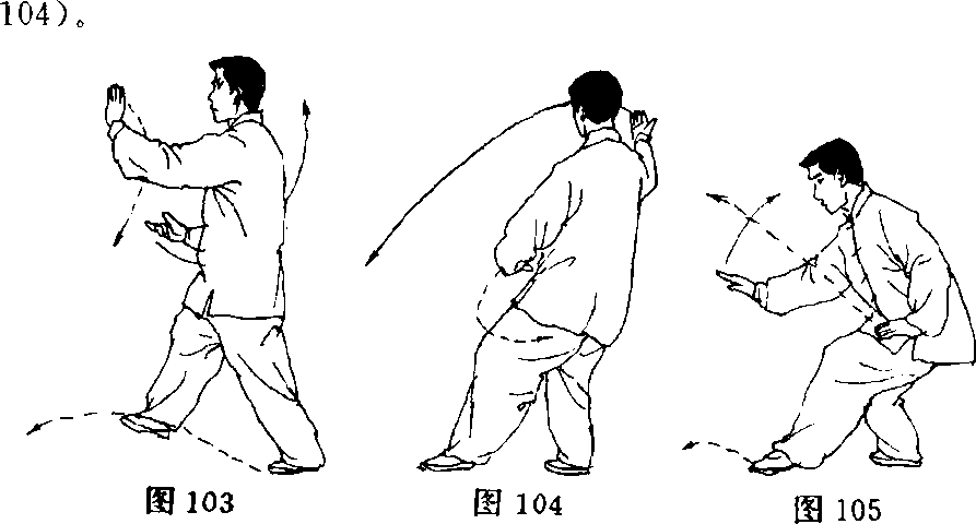 (3)重心仍在右腿,尽力屈蹲,成左虚步,上体微左转,并微前 倾;右手向前弧形下按于体前,同腹高,掌心朝下,指尖向前,右手 与右脚相照;左手弧形向左经左膝上向后搂至左胯旁,掌心朝下, 指尖向前;眼看右手(图105)。(结束动作定势朝酉)