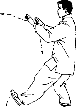 (1) 身体立起,左脚向前进半步,脚跟着地;右臂屈肘,右手提 收于胸前,掌心斜朝下,左手向前上经右手下穿出;眼看左手(图 106)。