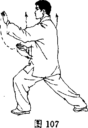 (2) 左脚踏平,重心移向左腿,屈膝前弓,成左弓步。左手继续 向前伸穿,手指斜朝上,同须高,掌心斜朝下,右手落至腹前,掌心 斜朝下;眼看左手(图107)。(结束动作定势朝西)