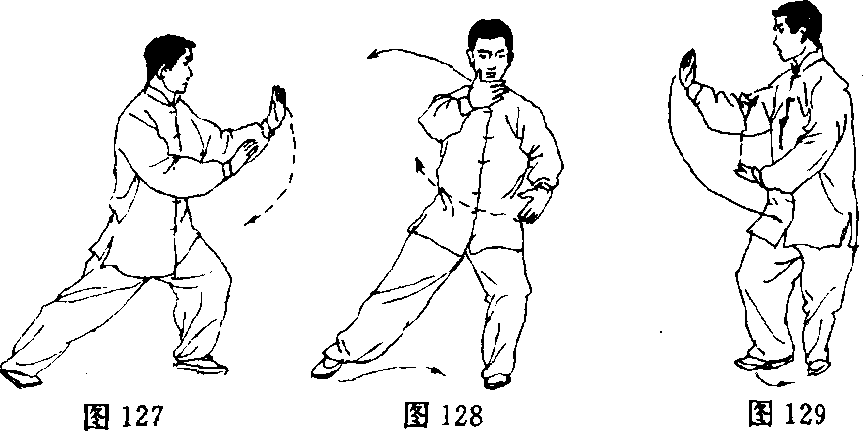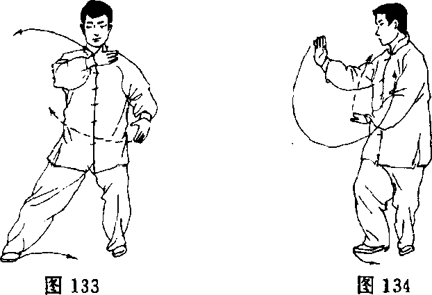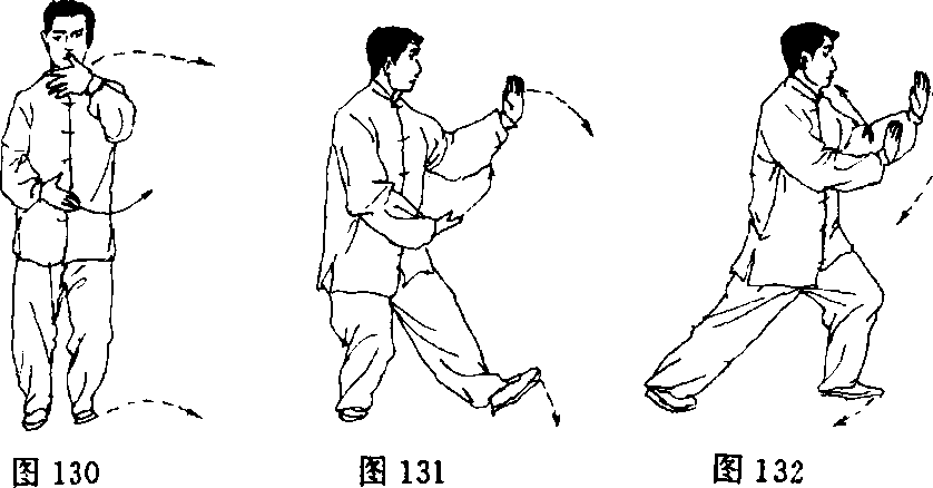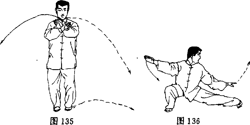 (1) 右脚以脚跟为轴内扣,上体右转,重心移向右腿并屈蹲;随 体转,左手向上、右手向下划弧,两手腕在胸前相搭,左手在上,右 手在下;眼看前方(图135)。