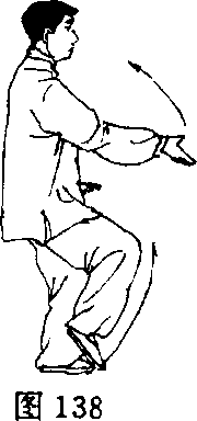 (1) 右腿蹬地,左腿屈膝前弓,重心移至左腿,右脚收提至左脚 内侧,右手向前撩出,同腹高,掌心斜朝上,手指斜向下;左手向下 向后弧形收至左胯旁,掌心朝下,指尖向前;眼看右手(图137、 138)。