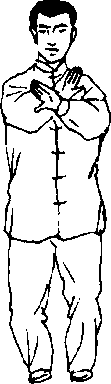 (1)左腿屈膝微蹲,右脚下落至左脚右前侧,前脚掌着地,支撑 重心,而后左右两脚以前脚掌为轴依次向左碾转,随之,身体左转, 重心再移向左腿,左臂向上、右臂向下弧形于胸前相合,,两腕相搭