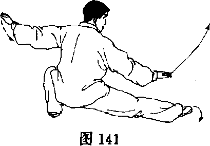 (2)重心移至左腿并屈蹲,右腿向右仆步,两臂向上向体侧朝 下分落,两掌心朝下;右手指向右,腕同腰高,左手指向左,腕同肩 高;眼看右手(图141)。(结束动作定势朝东)