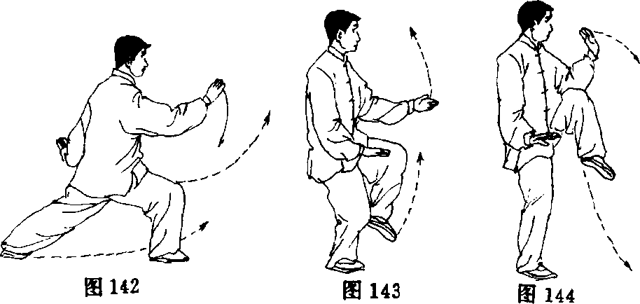 (1)左腿蹬地,右腿屈膝前弓,重心移至右腿;左脚收提至右脚 内侧,左手向前撩出,同腹高,掌心斜朝上,手指斜向下;右手向下、 向后弧形收于右胯旁,掌心斜朝下,指尖向前;眼看左手(图142、 143)。