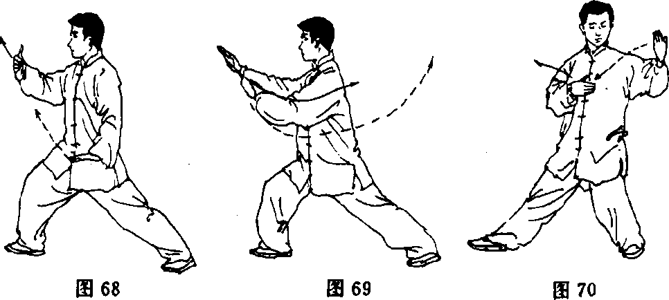 (3) 上体微右转,右拿向前伸并翻掌,掌心向下,左掌外旋掌心 转向上,经腹前向上、向前伸至右前臂左下方;眼看右掌(图69)。