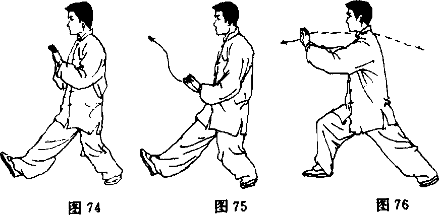 (7) 重心前移成右弓步;两掌下落经腹前向前向上按出,两臂 微屈,两腕同肩平;眼看两掌(图75、76)。