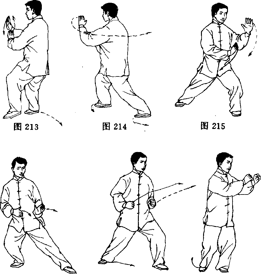 (2) 右脚内扣,左脚外摆,身体左后转;重心移向左腿,并屈膝 前弓;随之两臂向左后平摆;眼随看左手(图215)。