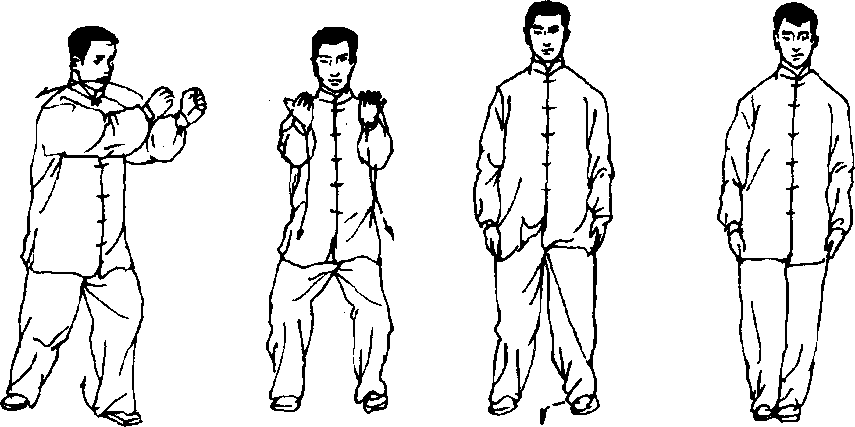 (2) 两腿伸膝,身体慢慢升起;同时两掌心翻向下,徐徐下落于 大腿外侧;左脚提收与右脚并拢,身体直立,眼看前方(图221、 222)(结束动作定势朝南,与起势相同)