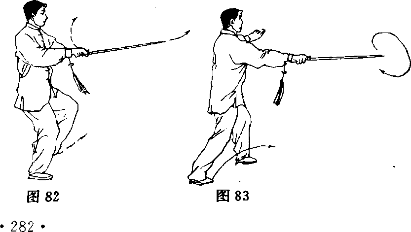 左脚跟至右脚内侧(脚不触地),身体略右 转;同时右手握剑略屈肘右带,腕同腰高,剑尖朝左前;左手剑指仍 附于右腕内侧;眼视剑尖(图82)。