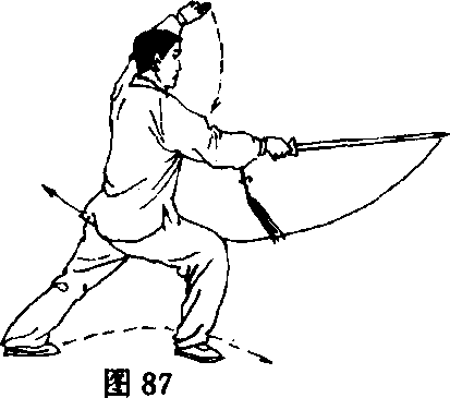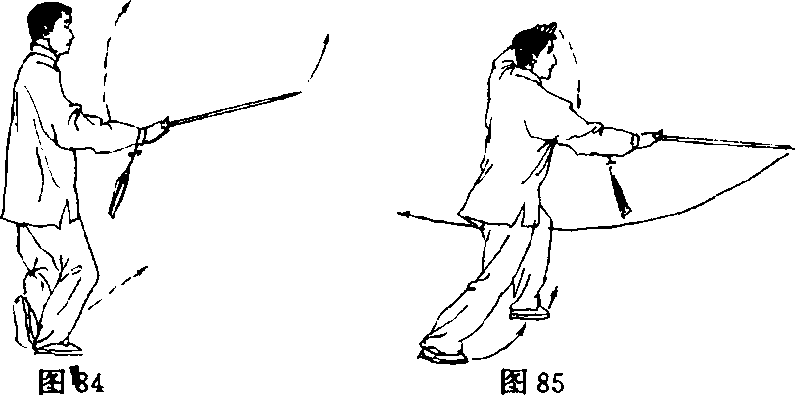 (1) 身体重心前移,右脚跟至左脚内侧(脚不触地),身体略左 转;同时右手握剑,剑刃领先,经下向左后方划弧至左腹前,臂微 屈,手心斜朝上,剑尖朝左后下,与胯同高;左手剑指屈肘向下落于 右前臂上,手心朝外;眼视剑尖(图86.86附)。