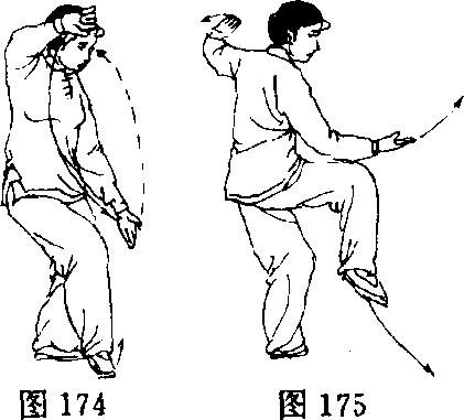 (1)	±体右转,随之右手外旋向左、向上划弧经胸前时,内旋向 上、向右划弧于额右前方,指尖朝左,掌心向外。左手向左、向下外 旋,向前划弧于左大腿外侧,指尖朝下,掌心向前;眼看左手(图 174)。
