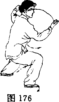 (3)	左腿屈膝下蹲,右脚以脚跟内侧贴地向右前铲出,重心移 向右腿,右脚尖落地踏实,屈蹲成右偏马步;同时左手微外展,指尖 朝左前上方,掌心向外。右手向右前上方穿出,指尖同鼻高,掌心向 右后方;眼看右手(图176)。