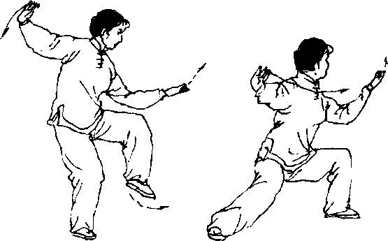 (2)	身体左转,右腿屈膝提起,膝同腹高,右脚尖自然下垂,同 时左手外旋继续向右、向上划弧经胸前时,内旋向上、向左、向下划 弧于身体左侧,腕同肩高,指尖朝左前上方、掌心向外。右手向右、 向下,外旋向前、向左划弧于右膝前上方;眼看右手(图175)。