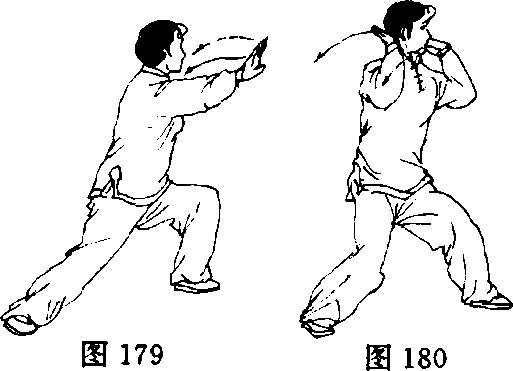 (1)身体重心稍移向左腿,上体微左转;随之左手向左前伸,腕 同肩高。右手向前、向左划弧于右肩前,右腕稍高于肩,掌心向外, 接着重心稍移向右腿,上体微右转;随之左臂屈肘,左手内旋向左、 向后、向右划弧收于左肩上,指尖朝后,掌心向上;右手内旋向前、 向左划弧,右臂屈肘,右手继续向后、向右划弧于右肩上,指尖朝 后,掌心向上;眼看左前方(图179、180)。