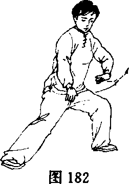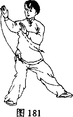 (2)重心移向右腿,上体右转;随之右手微内旋向右、向前划弧 伸出,腕稍高于肩、掌心向外。左手内旋向右、向下划弧于右胸前, 掌心斜向下。接着身体左转,重心移向左腿s同时两手向下、向左划 弧,左手于左腰前,指尖朝右下方,掌心斜向下。右手于胯右前方, 指尖朝右下方,掌心斜向下;眼看右手(图181、182)。