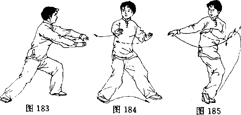 (3) ±体微左转,重心移向左腿;随之两手向左、向前、向上划 弧,同胸高,掌心向下。接着上体右转,重心移向右腿;随着两手平 着向右划弧于体前,同胸高,两手相距稍宽于肩,手心向下。紧接右 脚收至左脚内侧,脚尖点地,两腿屈膝,右膝稍内合;两手继续向右 划弧,右手下落同腰高,左手至右胸前:眼看右手(图183、184、 185)。