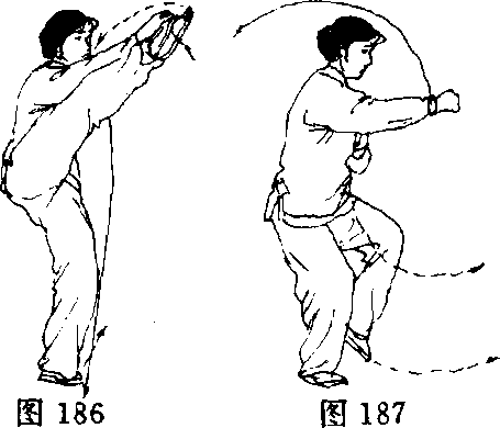 (4) 重心全部移至左腿并微屈;右脚向左、向上、向右划弧摆起 于胸前时,两手向左、向上依次击拍右脚面;眼看右手(图186)。