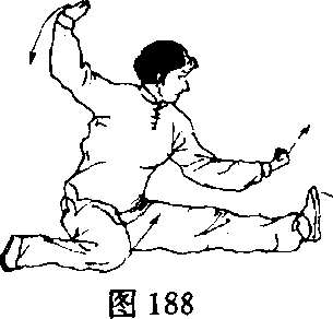 右、向下划弧收于右胸前,拳眼向上。接着右腿屈膝下蹲,左脚尖翘 起,以脚跟贴地向左前铲出,右膝里扣,松胯合裆下沉,臀部、右膝 内侧和左腿后侧贴地。右臂微屈,右拳经面前向上、向右弧形举于 右肩前上方,拳心向外。左拳向下随左脚铲出前伸,拳心向上;眼看 左拳(图 187、188)。’