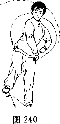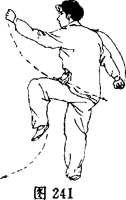 (1) 重心全部移至左腿并伸起,右腿屈膝提起;上体微左转,随 之伸右臂向右、向下、向左内旋划弧,右拳至左胯前,拳心向右,左 臂微屈,左拳落于左腰侧;接着左脚蹬地跳起向右后转身(胸向西 北),而后右脚落地,左脚提起;随跳转身,右臂向上绕环一周至身 体右前斜下举,左臂向左、向上、向右划弧下劈至左前斜上举;眼看 左拳(图 240、241)。