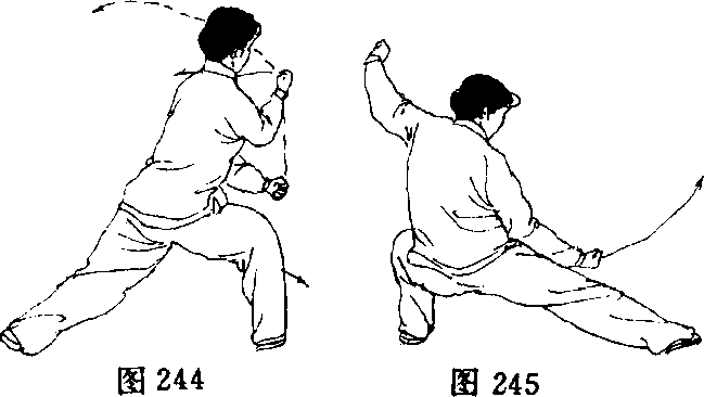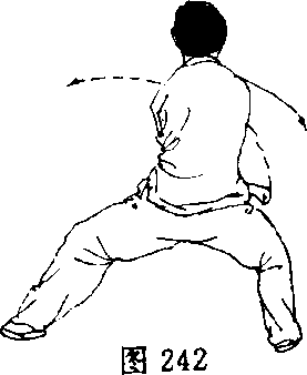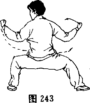 (2) 左脚向左前落步,两腿屈蹲,两臂上下弧形绕至腹前交叉, 右臂在外(含胸拔背,蓄劲);接着重心稍移向左腿成偏马步;两臂 屈肘,短促、迅速发力,两拳以拳背为力点向上、向左右分击,拳与 肩同高;眼看左拳(图242、243)。