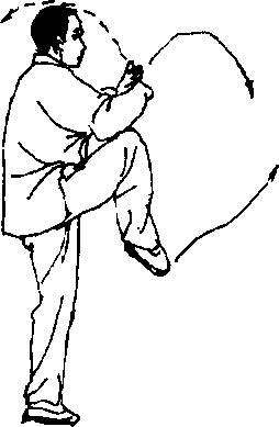 (1) 右小腿屈膝回收,脚尖下垂;同时上体微右转(胸向东),随 转体两臂屈肘,两手向内、向下合于体前(右膝两侧前上方),手心 向上,两手相距10厘米;眼看两手(图144) o