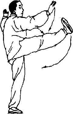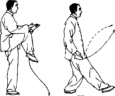 两拳变掌,左手向下,右手向上在胸前相合搭腕,右手在外,手 心均向里孑右脚尖先向下松垂,接着脚尖翘起,右腿由屈到伸,以脚 跟为力点,向右前方(东南)蹬出,脚高过膝;两手随蹬腿分别向上、 向两侧伸臂分展,腕高于肩;眼看右手(图142.143).