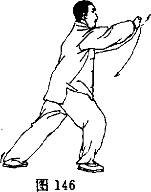 (2) 左腿屈膝,右脚向前落步,脚跟着地,随之两手分别落于胯 旁,手心均斜向上;接着,右脚尖落地踏实,重心前移成右弓步;同 时,两手变拳分别由体侧向前上方划弧举至体前,两臂微屈,拳高 与耳平齐,拳眼斜相对,拳面斜向上,两拳相距约10厘米;眼看两 拳之间(图145、146)。