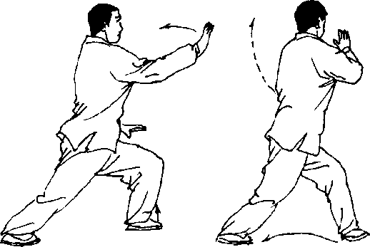 (7) 上体右转,右脚向前上步,脚跟轻轻落地;左臂屈肘,左手 收至耳旁,手心斜向前,而后向右、向下划弧至腹前;眼视前方(图