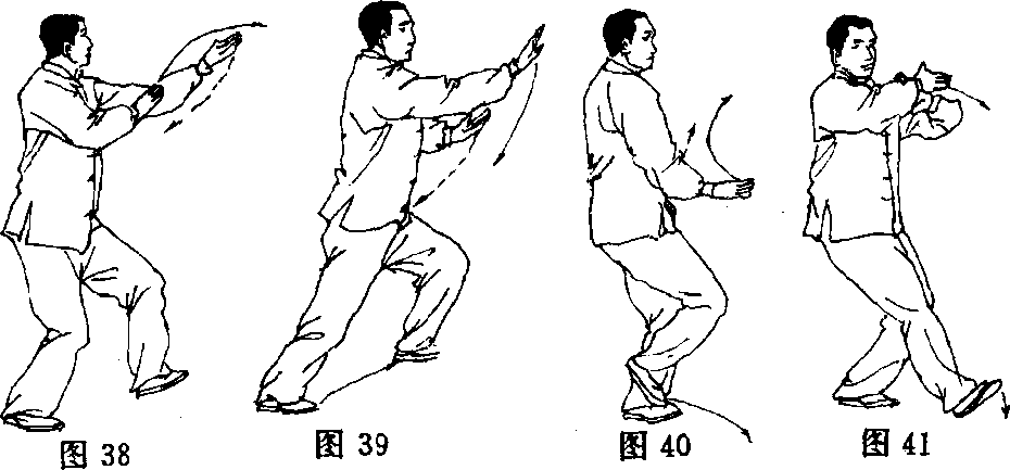 (1) 重心稍后移,左脚尖内扣,上体右转;左拳变掌,右掌向右 划一平弧,随即收于左前臂内侧;眼视左手(图38)。