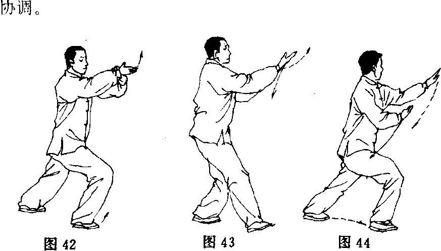 (6) 重心后移,右脚尖内扣,上体左转;右手翻转向上,左手划 一小弧从右前臂上穿出;眼视右手(图43)。