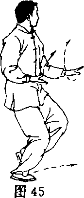 (8) 两手自前同时向下、向后捋,右手捋至右胯旁,左手捋至腹 前;左脚收至右脚内侧;眼视左前方(图45) 0