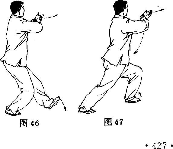 (10) 重心前移成左弓步;两臂同时向前挤出并撑圆,右手指贴 于左腕内侧,掌心向外,指尖斜向上;左掌心向内,指尖向右,高与 肩平;眼视左手(图47)。